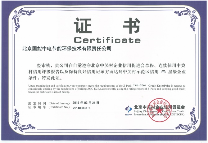 熱烈祝賀我公司榮獲“中關村示范區(qū)信用二星級企業(yè)證書”。國能中電已連續(xù)一年保持升級,證明國能中電在信用度方面贏得中關村管委會及中國人民銀行的認可,企業(yè)融資能力不斷攀升,我公司可享受比例為25%的企業(yè)貸款貼息。