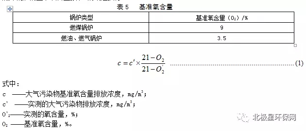 實(shí)測(cè)的鍋爐顆粒物、二氧化硫和氮氧化物排放濃度,必須按公式(1)折算為基準(zhǔn)氧含量排放濃度。燃煤鍋爐的基準(zhǔn)氧含量按表5的規(guī)定執(zhí)行。